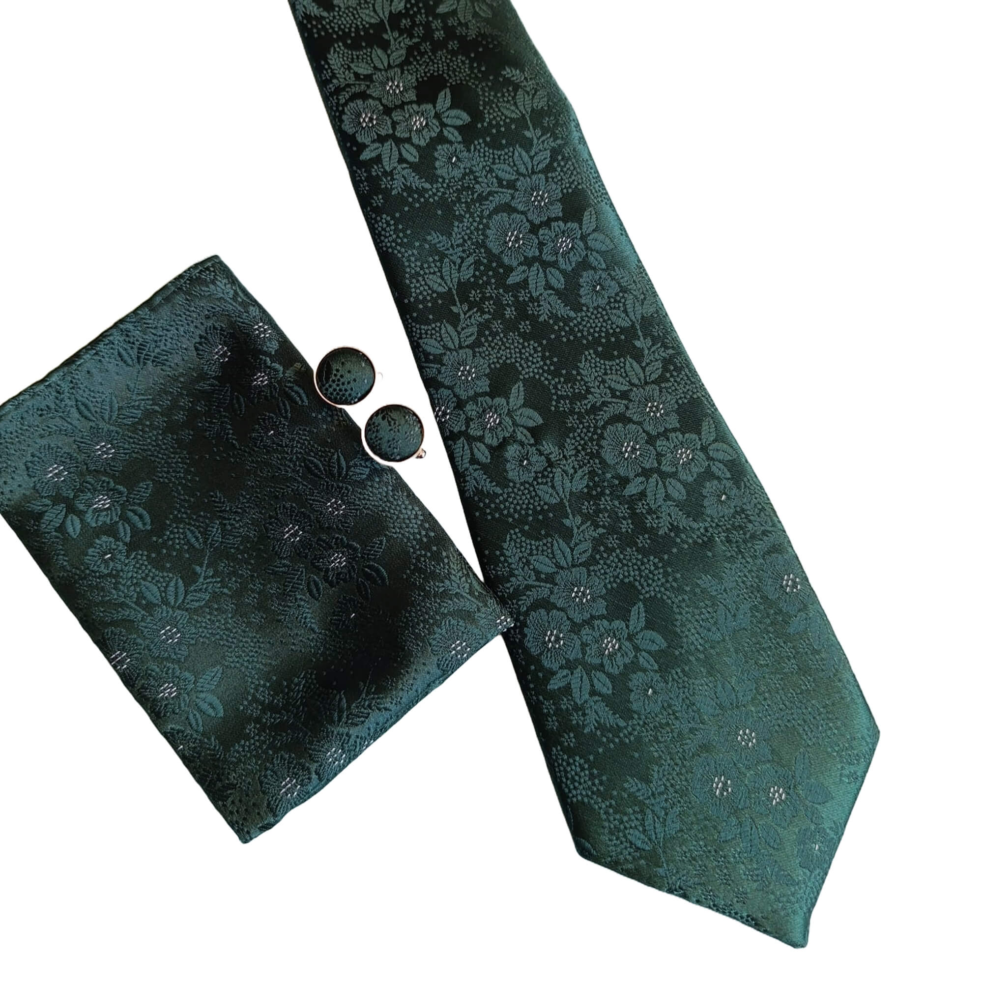 Set compus din cravata, batista de buzunar si butoni pentru camasa. Butonii sunt imbracati in acelasi material din care sunt confectionate cravata si batista.