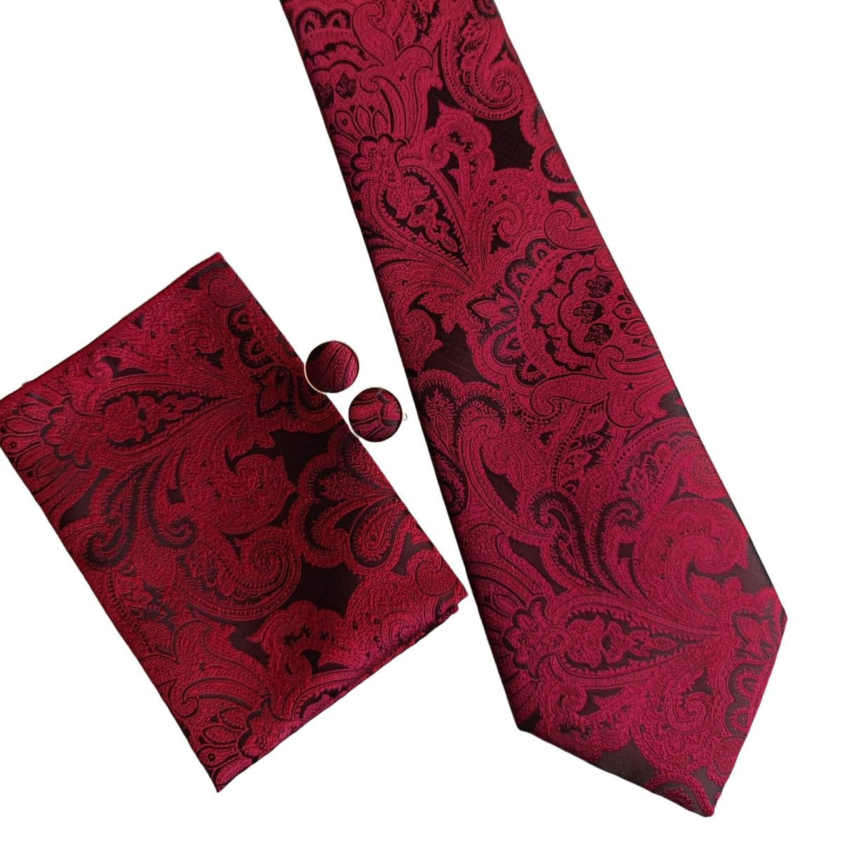 Set compus din cravata, batista de buzunar si butoni pentru camasa. Butonii sunt imbracati in acelasi material din care sunt confectionate cravata si batista.
