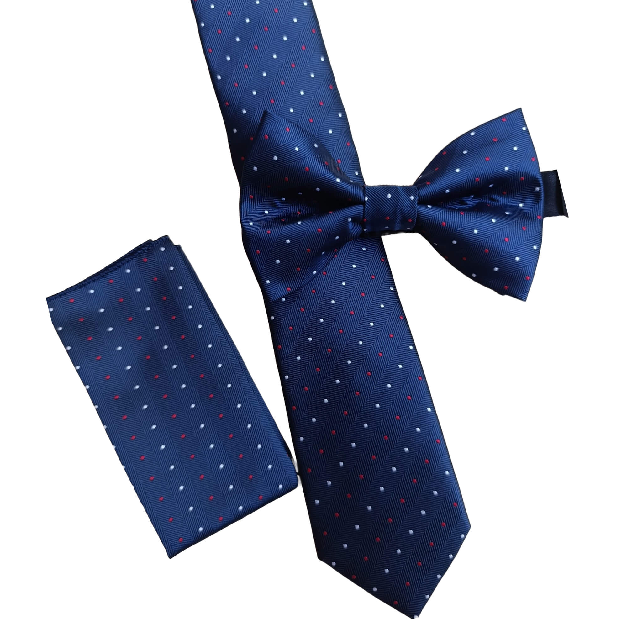 Set compus din cravata, batista de buzunar si butoni pentru camasa. Butonii sunt imbracati in acelasi material din care sunt confectionate cravata si batista.